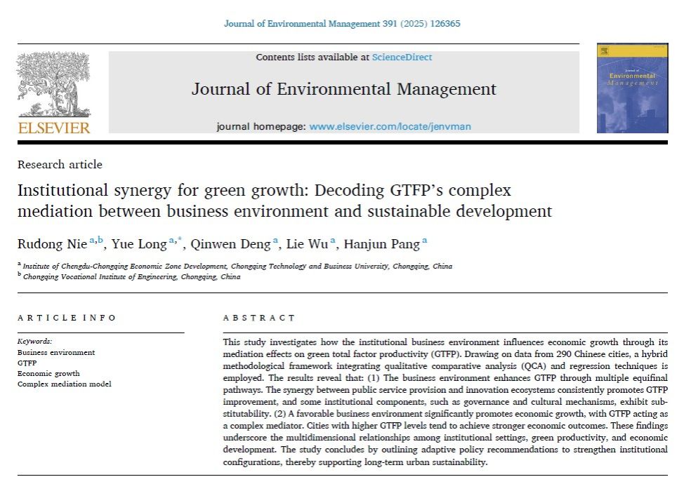近日,yl7703永利集团龙跃教授及指导的博士研究生聂儒冬在国际知名期刊“Journal of Environmental Management”发表了题为“Institutional synergy for green growth: Decoding GTFP's complex mediation between business environment and sustainable development”的学术论文。