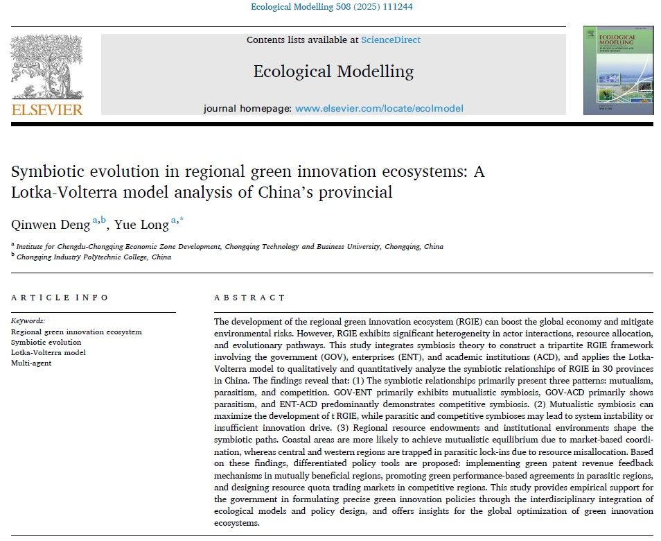 近日,中心人员龙跃教授及其博士研究生邓钦文在“Ecological Modelling”发表题为“Symbiotic evolution in regional green innovation ecosystems: A Lotka-Volterra model analysis of China’s provincial”的学术论文。