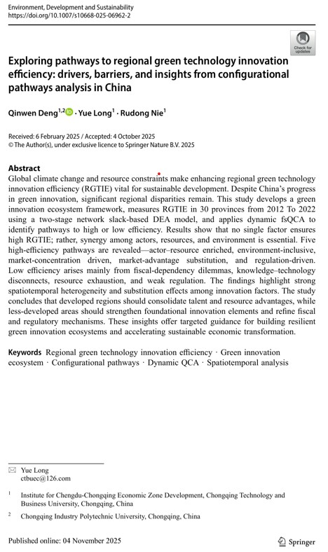 近日,中心人员龙跃教授及其博士研究生邓钦文在“Environment, Development and Sustainability”发表学术论文“Exploring pathways to regional green technology innovation efficiency: drivers, barriers, and insights from configurational pathways analysis in China”,探讨区域绿色技术创新效率提升路径及其驱动机制等问题。