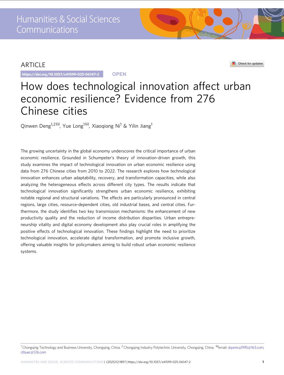 近日,中心人员龙跃教授及其博士研究生邓钦文在Nature旗下唯一面向人文社会科学的综合性期刊“Humanities & Social Sciences Communications”发表学术论文“How does technological innovation affect urban economic resilience? Evidence from 276 Chinese cities”。