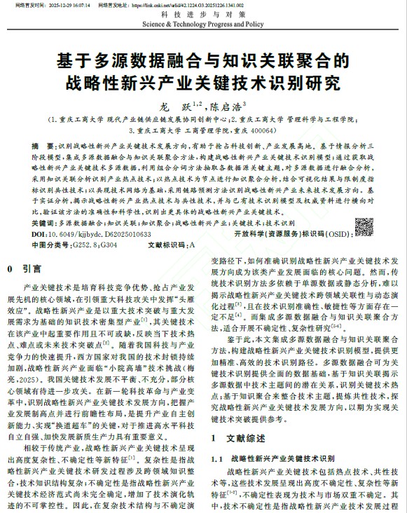 近日,中心人员龙跃教授及其硕士研究生陈启浩在《科技进步与对策》发表学术论文“基于多源数据融合与知识关联聚合的战略性新兴产业关键技术识别研究”。